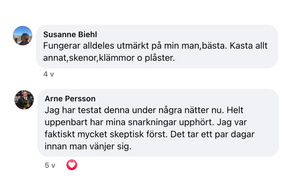 Beställde en för att prova, frugan helnöjd slipper mina snarkningar till 90%. Det bästa för mig att jag inte ligger och ”tuggar” i sömnen längre. Så än så länge är vi nöjda.